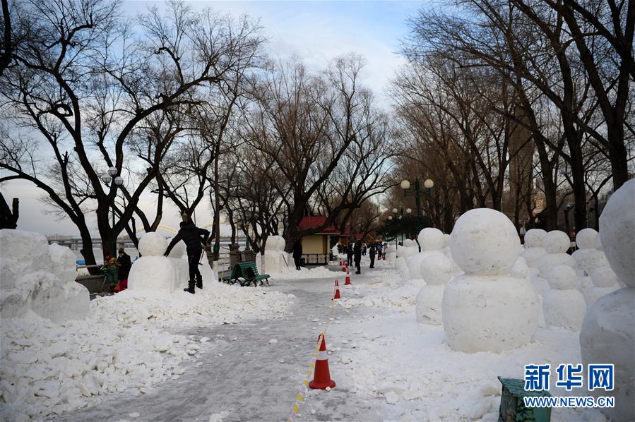 12月17日,冰雕師在松花江畔制作冰雕景觀。