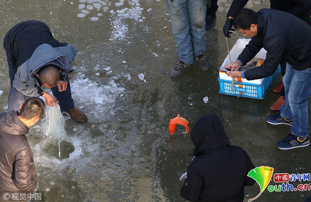 民眾鑿冰下網(wǎng)捕魚。