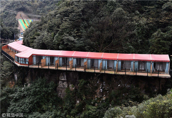 2017年11月16日,重慶萬盛一景區(qū)內的臨崖酒店依山而建,色彩絢麗如山間彩虹。據(jù)介紹,該酒店位于當?shù)貖W陶紀景區(qū)內,酒店順著山形而建盤旋在山間,特別顯眼。 周毅(重慶分社)/中新社/視覺中國