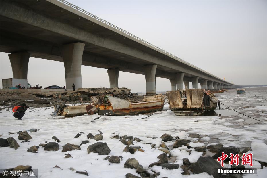 12月9日,受大風(fēng)降溫天氣影響,青島膠州灣北部冰情初現(xiàn),青島西海岸新區(qū)膠州灣跨海大橋入口處海冰層層疊疊,暫未對海上漁業(yè)生產(chǎn)帶來影響。張進(jìn)剛 攝 圖片來源:視覺中國