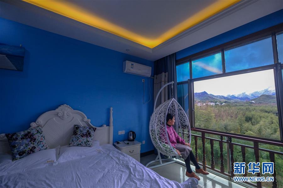 游客在河橋鎮(zhèn)一家名為“柳棲民宿”的房間里欣賞室外的風景(12月6日攝)。該民宿的主人是一名回鄉(xiāng)創(chuàng)業(yè)的青年。