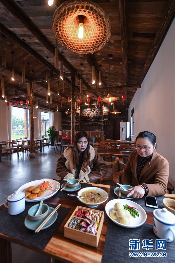 12月19日,章淑貞(左)在民宿“初憶小院”內(nèi)請(qǐng)一名客人品嘗自己做的點(diǎn)心。該民宿是河橋鎮(zhèn)“90后”女孩章淑貞開辦的,民宿融入了大量的現(xiàn)代建筑設(shè)計(jì)風(fēng)格,深受年輕人的喜愛。 新華社記者 徐昱 攝