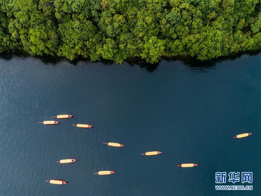 2018年7月23日,游客乘船在新安江浙江建德段江面上游玩。 大地之色,俯仰之間;壯美山河,是我的祖國。2018年,新華社記者操縱無人機(jī)“飛閱”華夏大地,在最美的時節(jié),定格下她的色彩斑斕。 新華社記者 徐昱 攝