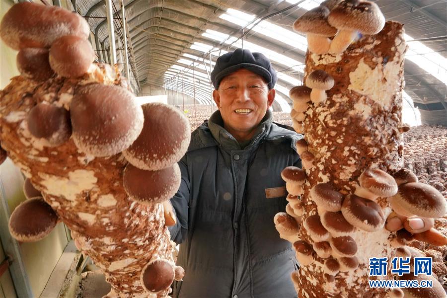 12月20日,唐山市豐潤區(qū)小美食用菌種植農(nóng)民專業(yè)合作社社員在展示種植的香菇。 新華社記者 牟宇攝