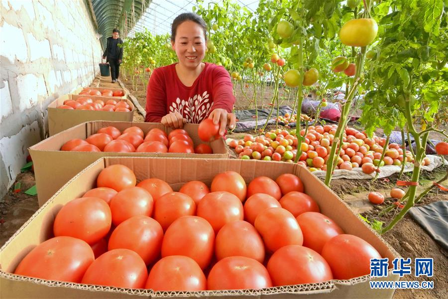 12月20日,唐山市豐潤區(qū)百草坡農(nóng)產(chǎn)品農(nóng)民專業(yè)合作社社員在大棚內(nèi)收獲西紅柿。 新華社記者 牟宇攝