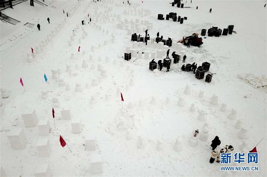在松花江哈爾濱段江面上,制作中的部分雪人(12月21日無(wú)人機(jī)拍攝)。