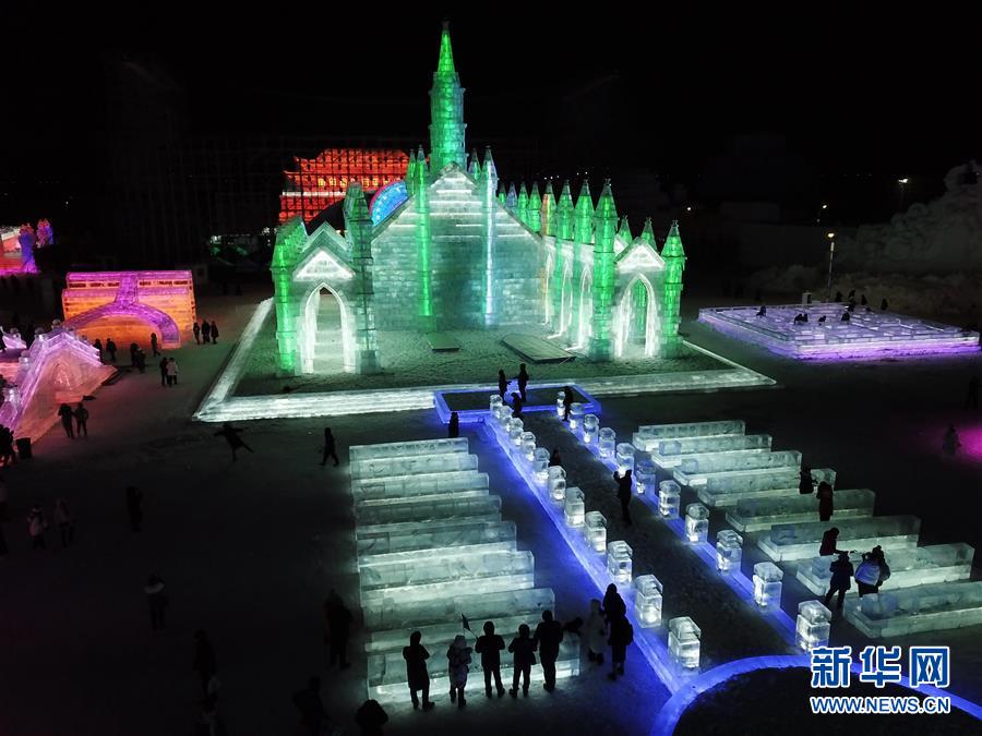 這是哈爾濱冰雪大世界園區(qū)內(nèi)的一處景觀(12月23日無人機拍攝)。