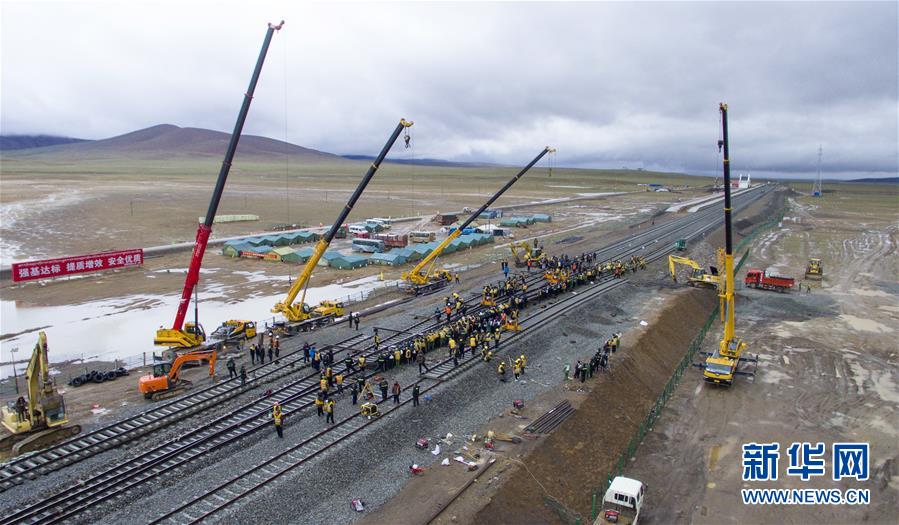 這是2017年7月26日無人機(jī)拍攝的青藏鐵路格爾木至拉薩段擴(kuò)能改造工程唐古拉車站撥接工作現(xiàn)場(chǎng)。 新華社記者 劉東君 攝