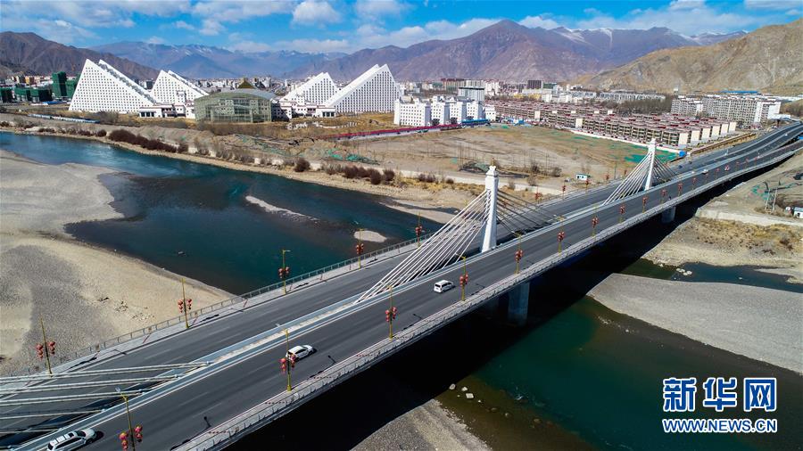 這是橫跨拉薩河的新建環(huán)城路納金大橋段(3月4日無人機(jī)拍攝)。 新華社記者 晉美多吉 攝