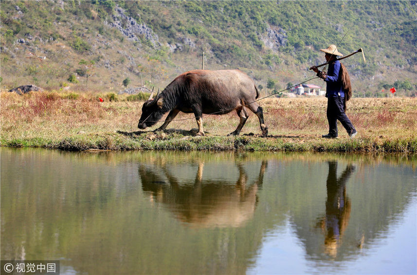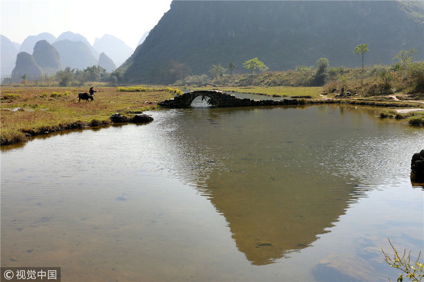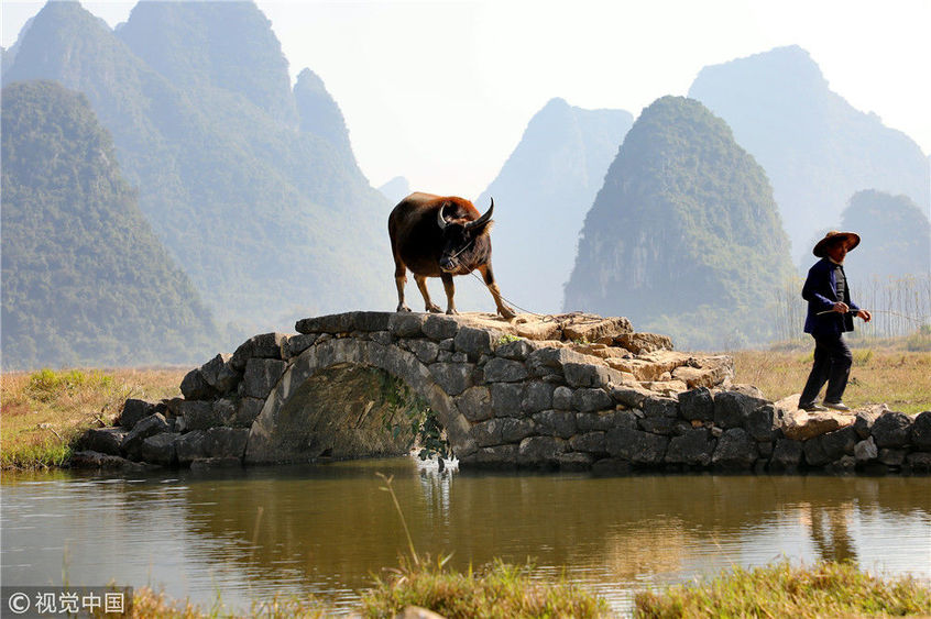 12月17日,在廣西桂林的臨桂區(qū)田心村這座叫做狀元橋的小橋上,剛吃過(guò)午飯,老許和他的水牛搭檔又要開(kāi)始一場(chǎng)生態(tài)演出了。