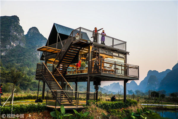 2018年12月17日,廣西桂林,陽朔縣遇龍河畔。黃昏時(shí)分,游客站在觀景臺(tái)觀賞泡泡屋及周邊景觀。