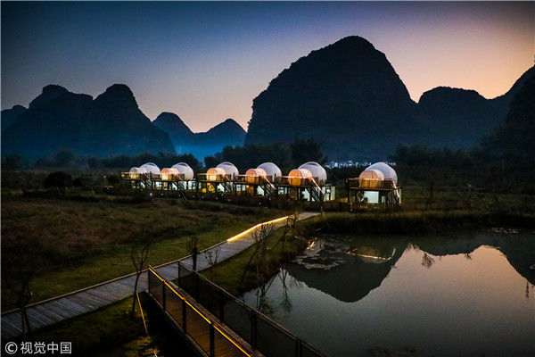 2018年12月17日,廣西桂林,陽朔縣遇龍河畔。夜色中的泡泡屋。