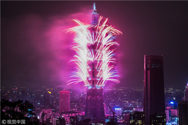 2018年1月1日,臺(tái)北101大樓燃放焰火迎接新年的到來(lái)。