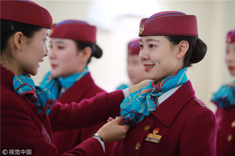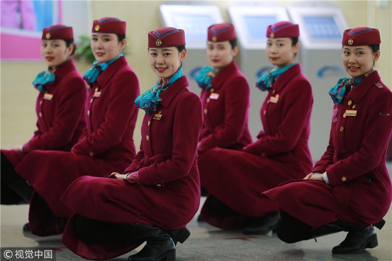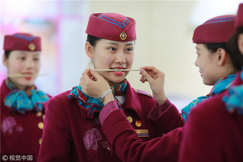 2018年12月27日,四川成都,為備戰(zhàn)即將開通的成雅鐵路,中國鐵路成都局集團(tuán)有限公司成都客運(yùn)段動(dòng)車二隊(duì)對成雅動(dòng)車的乘務(wù)人員進(jìn)行理論、形體、服務(wù)禮儀等內(nèi)容的培訓(xùn)。蘇志剛/視覺中國
