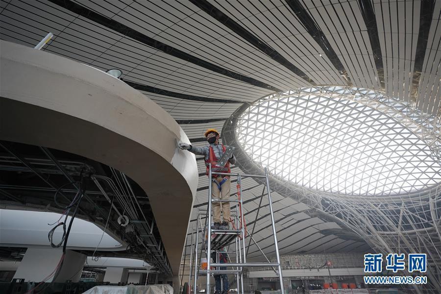 在北京大興國際機(jī)場主航站樓內(nèi),施工人員在進(jìn)行裝飾裝修工作。新華社記者 鞠煥宗 攝 圖片來源:新華網(wǎng)