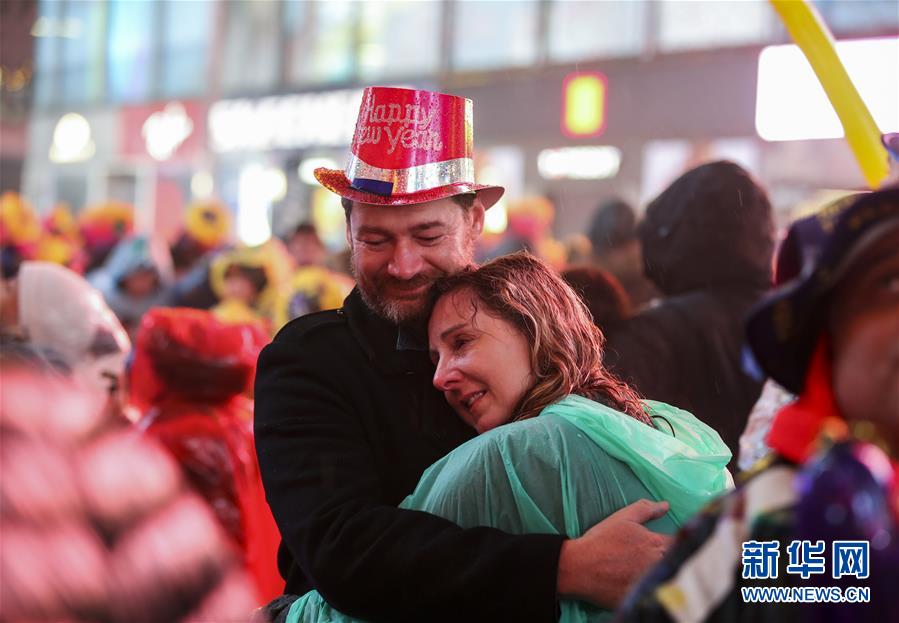 1月1日,在美國紐約時報廣場,人們在雨中參加跨年活動。 新華社記者秦朗攝