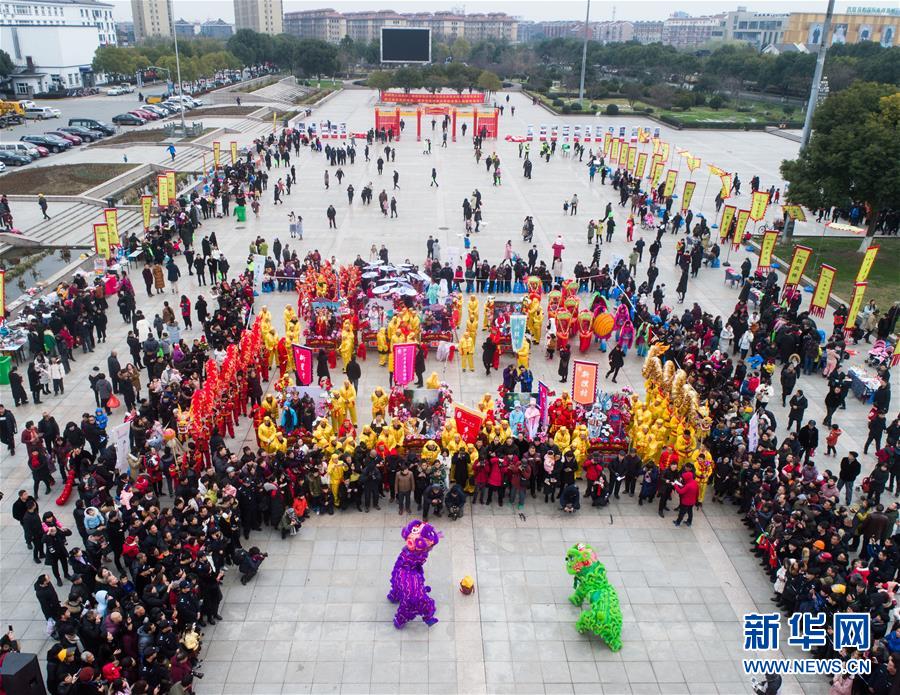 1月1日,演員在展演活動上進行舞龍舞獅等非遺傳統文化表演(無人機拍攝)。2019年元旦,浙江省桐鄉(xiāng)市濮院鎮(zhèn)舉辦新年“非遺文化藝術節(jié)”活動,濮院鎮(zhèn)下屬多個鄉(xiāng)村的傳統美食制作、手工藝品、非遺文化表演等鄉(xiāng)村特色非遺項目在濮院鎮(zhèn)中心廣場進行集中展示展演。新華社記者 徐昱 攝