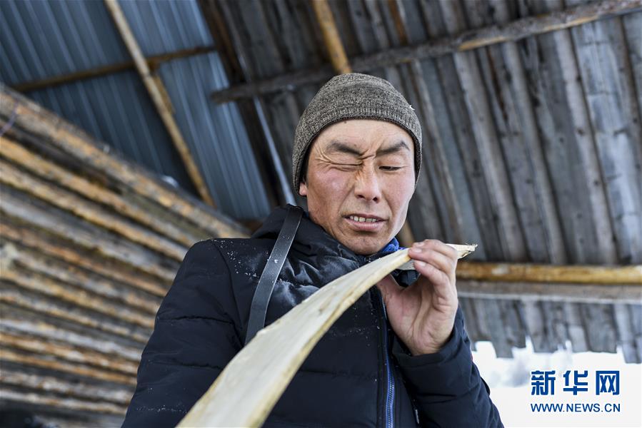 在新疆布爾津縣禾木村的一處冬季牧場(chǎng),森格爾在制作毛皮滑雪板時(shí)檢查滑雪板的平面(1月3日攝)。新華社記者 胡虎虎 攝