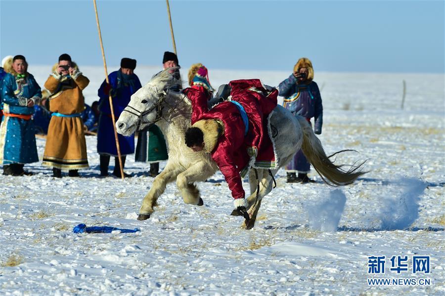 1月8日,牧民表演馬背拾哈達。 時下正值草原冬季旅游旺季,內(nèi)蒙古自治區(qū)西烏珠穆沁旗的牧民們在雪原上一展身手,為游客展現(xiàn)獨特的民族風情。 新華社記者 鄒予 攝