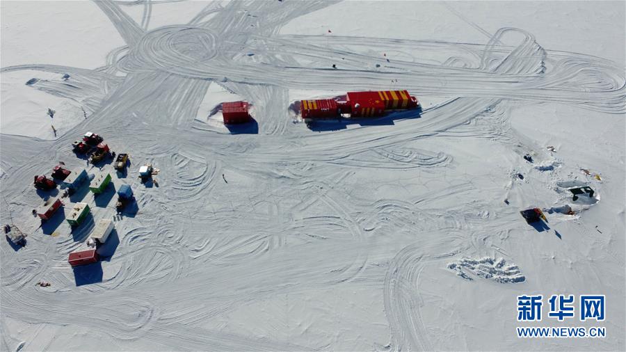 1月13日無人機(jī)拍攝的中國第35次南極科考隊(duì)昆侖隊(duì)營地(左)、昆侖站(中)與深冰芯房。 新華社記者 劉詩平 攝