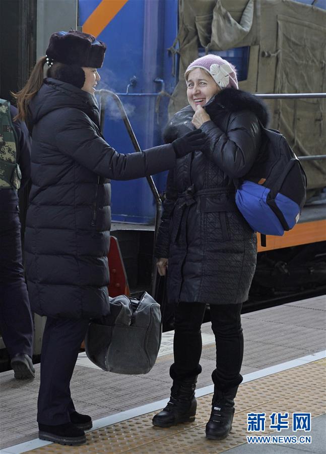 1月11日,在滿洲里火車站站臺,“金鑰匙”服務(wù)臺客運(yùn)員協(xié)助外籍旅客乘車。