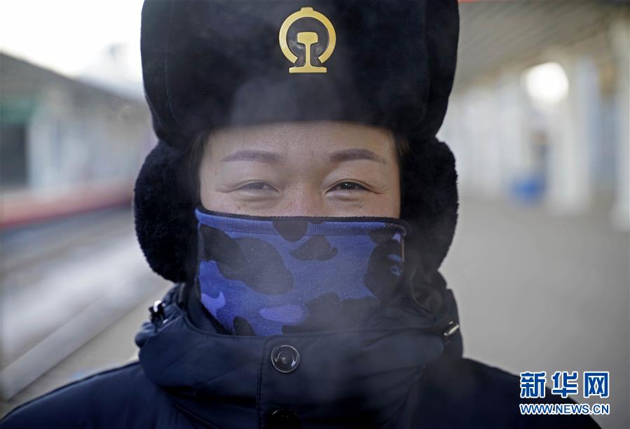 1月11日,在滿洲里火車站站臺,由于氣溫近零下30攝氏度,“金鑰匙”服務(wù)臺客運(yùn)員“呵氣成霧”。