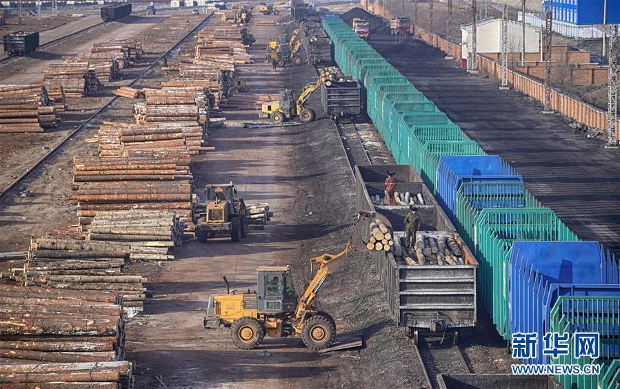 1月12日,在滿洲里鐵路口岸站裝卸二車間原木換裝場區(qū),工作人員進(jìn)行原木裝車作業(yè)。 新華社記者 才揚(yáng) 攝