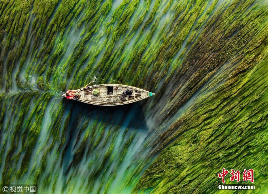1月14日訊(具體拍攝時(shí)間不詳),孟加拉國烏拉帕拉,漁船在水流和藻類的映襯下前行,畫面看起來就像水彩畫一般。圖片來源:視覺中國