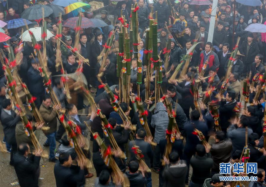 1月14日,人們?cè)趶V西融水苗族自治縣紅水鄉(xiāng)舉行的蘆笙節(jié)上賽蘆笙。