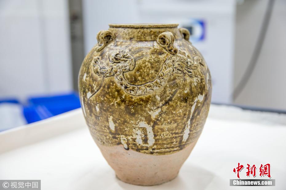 近日,廣東省博物館文物保護(hù)科技中心出水文物保護(hù)實(shí)驗(yàn)室里,一個(gè)修復(fù)后的出水明代四系醬釉龍紋罐。譚慶駒 攝 圖片來(lái)源:視覺(jué)中國(guó)