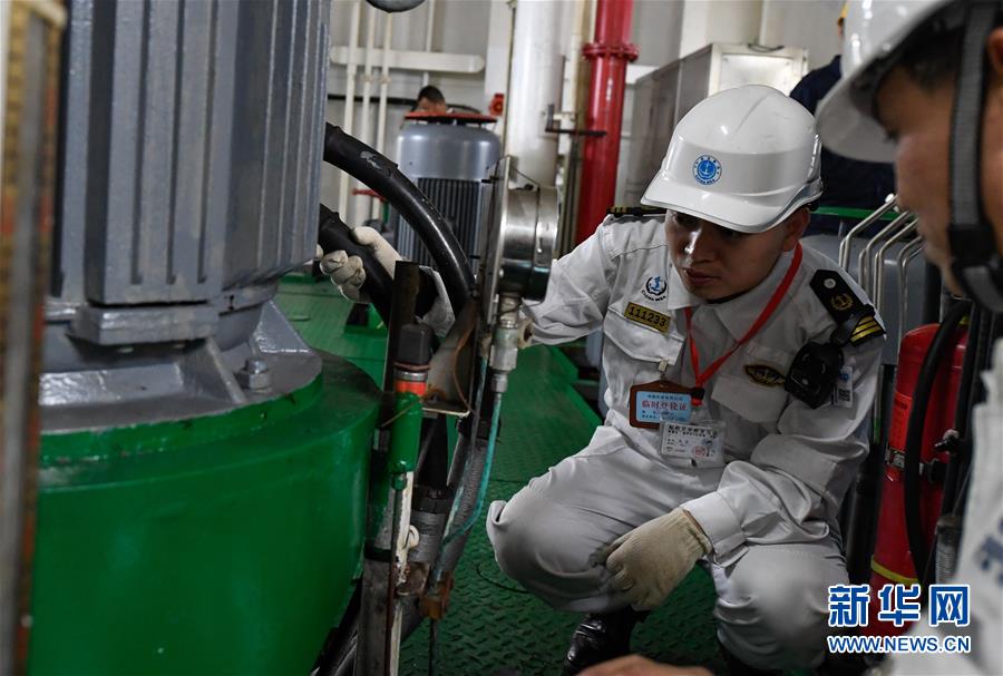 1月15日,??诤J戮止ぷ魅藛T在粵海鐵4號(hào)客滾船的機(jī)艙內(nèi)進(jìn)行檢查。新華社記者 楊冠宇 攝