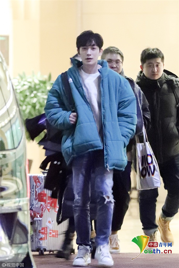 1月15日,北京,朱一龍現身機場。他穿綠色棉襖一路插兜保暖,搭配破洞褲潮范兒十足長腿搶鏡,打扮簡單毫無男神包袱,看鏡頭還一臉呆萌,但氣質仍然出眾。