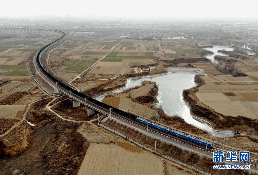 1月15日,一列重載列車(chē)行駛在瓦日鐵路紅旗渠至水冶南區(qū)段(無(wú)人機(jī)拍攝)。