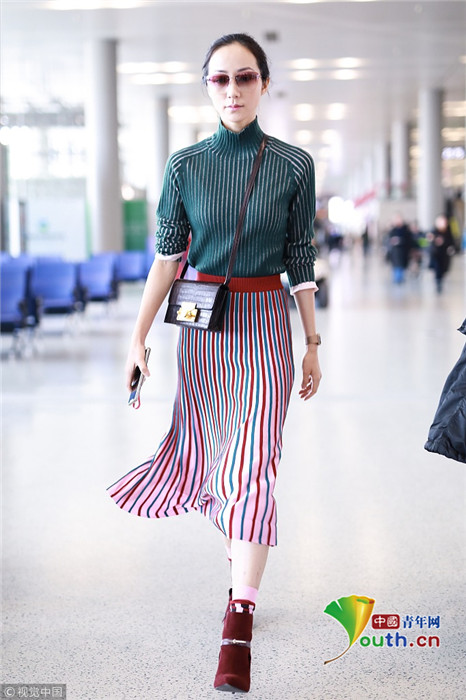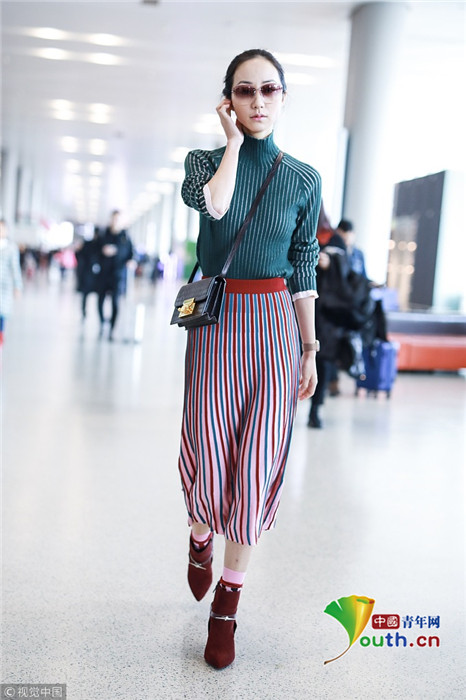 2019年1月17日,上海,韓雪現(xiàn)身機場,穿著條紋紗裙露出小腿,十分抗凍,她搭配經(jīng)典的駝色大衣,氣質出眾在機場人群中相當搶鏡。
