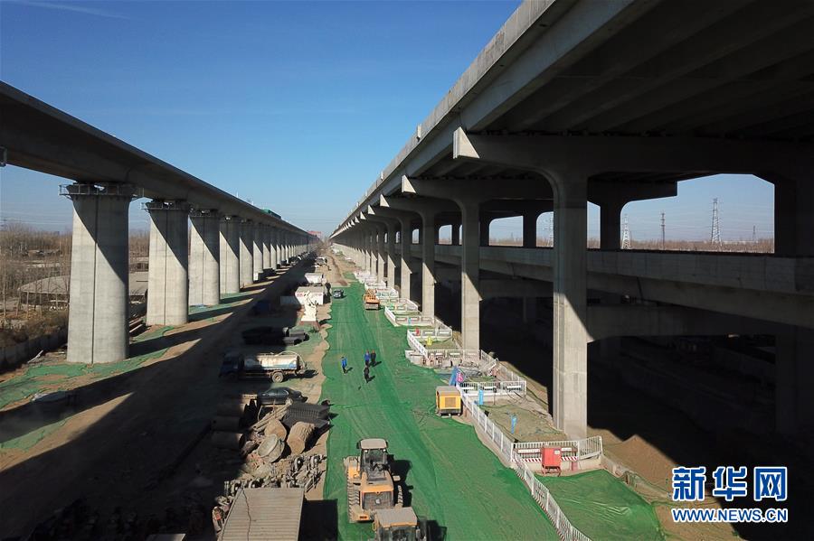 這是建設(shè)中的北京大興國(guó)際機(jī)場(chǎng)高速公路和北京軌道交通新機(jī)場(chǎng)線(2018年12月29日無(wú)人機(jī)拍攝)。新華社記者 鞠煥宗 攝