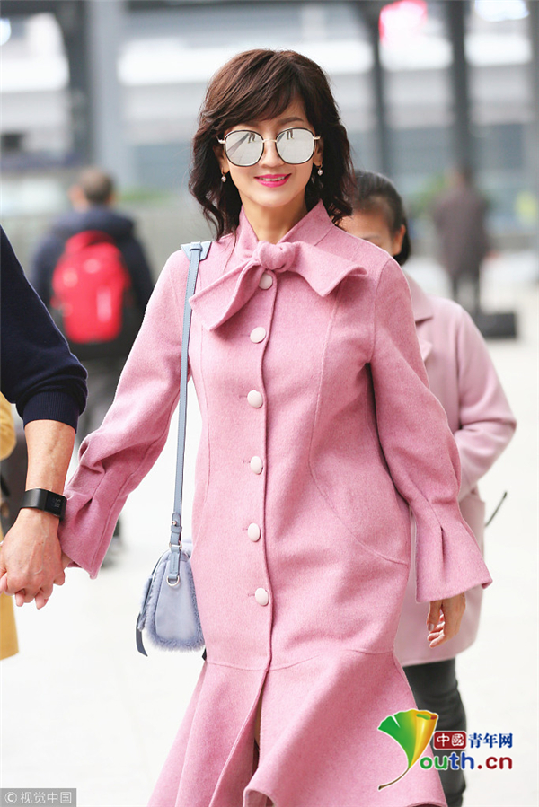 趙雅芝著粉嫩魚尾大衣優(yōu)雅甜美 獲老公一路牽手