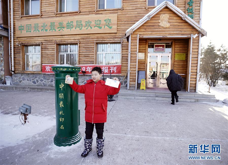 1月24日,游客在黑龍江省漠河市北極村郵政局前留影。該郵政局是我國最北的郵政局。新華社記者王毓國攝