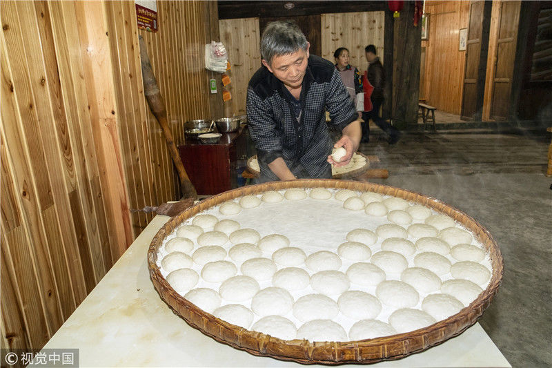 重慶江津區(qū)中山古鎮(zhèn)第十四屆 “千米長宴”民俗文化節(jié)盛大啟幕。上午10時,中山古鎮(zhèn)老街人聲鼎沸,窄窄的青石板路打掃得干干凈凈,家家戶戶門口掛起喜慶的紅燈籠,老商鋪門口擺滿了米酒、烤糍粑、煙熏豆腐……此次“千米長宴”以“絲路情緣,‘埃’上中山”為主題?!扒组L宴”期間,游客們不僅可以一雙筷子吃遍全街,還可欣賞到祈福祭祀、民俗拜年、“打盆上菜”等表演,同時還增設了以唱、跳、講故事的上菜方式情景演繹愛情主題的文化餐飲,展示富硒愛情宴的文化內涵。圖為街坊們在頭天就開始準備各種菜肴與小吃。
