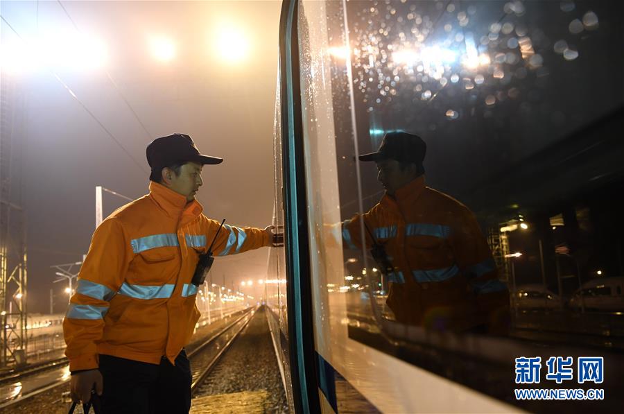 1月29日,王瑞在合肥南動(dòng)車運(yùn)用所進(jìn)行動(dòng)車組連掛作業(yè)。新華社記者劉軍喜攝