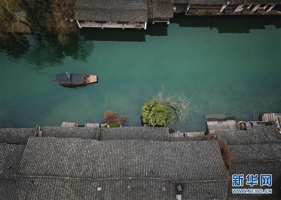 2月25日,游人在烏鎮(zhèn)景區(qū)內(nèi)乘船觀光(無(wú)人機(jī)拍攝)。 隨著氣溫升高,浙江省桐鄉(xiāng)市烏鎮(zhèn)景區(qū)春意萌動(dòng)。 新華社記者翁忻旸攝