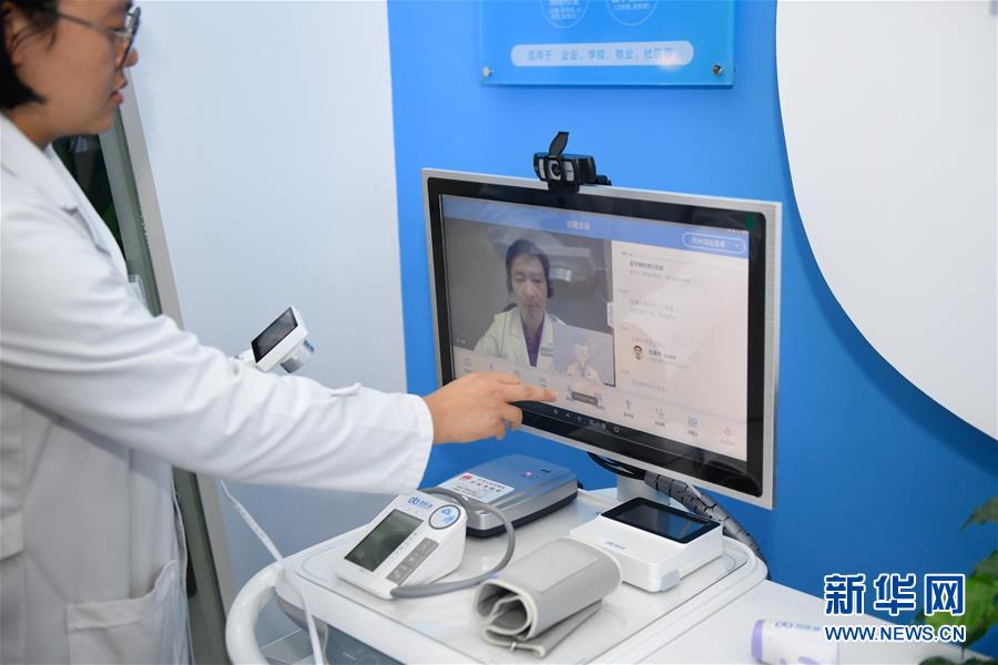 11月6日,烏鎮(zhèn)互聯(lián)網(wǎng)醫(yī)院的員工在操作“智能醫(yī)務(wù)室”與醫(yī)生的視頻連線功能。據(jù)了解,“智能醫(yī)務(wù)室”由智能移動(dòng)醫(yī)療一體機(jī)、智能藥柜以及一系列檢查設(shè)備組成,根據(jù)健康檔案和檢查結(jié)果,視頻連接家庭醫(yī)生就能解決常見的醫(yī)療健康問題。 新華社記者黃宗治攝