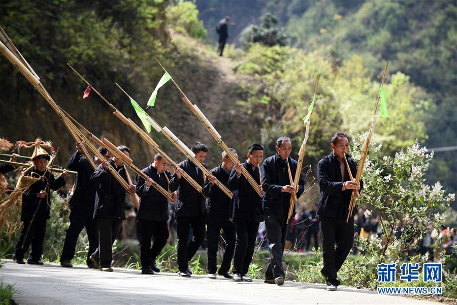 4月7日,苗族群眾吹著蘆笙走在參加“三月三”民俗活動(dòng)途中。4月6日至7日,在貴州省黔東南苗族侗族自治州劍河縣觀么鎮(zhèn)新民村和新合村,來(lái)自劍河縣和三穗縣的苗族同胞歡聚一堂,通過(guò)民族歌舞展演、非遺手工藝展示、千戶(hù)祭“巫耶”、跳蘆笙舞等形式,與來(lái)賓一起歡慶2019年高雍苗族“三月三”民俗文化節(jié)。 新華社記者 楊文斌 攝