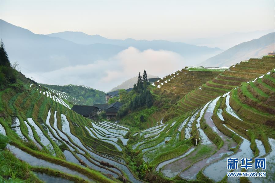龍勝各族自治縣和平鄉(xiāng)平安村一景(4月7日攝)。連日降雨過后,廣西龍勝各族自治縣和平鄉(xiāng)平安村的壯族村寨迎來久違的朝陽。 新華社記者 曹祎銘 攝