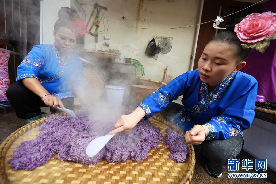 4月17日,在貴州省臺江縣姊妹街哆蝶五彩姊妹飯體驗店,苗家婦女在攤晾五彩“姊妹飯”。 新華社記者 楊文斌 攝