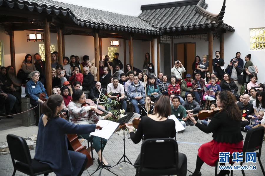 2018年2月24日,人們?cè)诿绹?guó)紐約大都會(huì)博物館“明軒”欣賞演出,慶祝新春佳節(jié)。中式庭院“明軒”是中國(guó)第一個(gè)落戶(hù)海外的蘇式園林,位于美國(guó)紐約大都會(huì)博物館二層的玻璃天棚下,是模仿中國(guó)蘇州網(wǎng)師園中的“殿春簃”設(shè)計(jì)建造而成的?!懊鬈帯庇商K州市園林管理局承建,所用的磚、瓦、木材、構(gòu)件等在中國(guó)備好后,由20余名中國(guó)工程師和工匠在美國(guó)組裝。 新華社記者王迎攝
