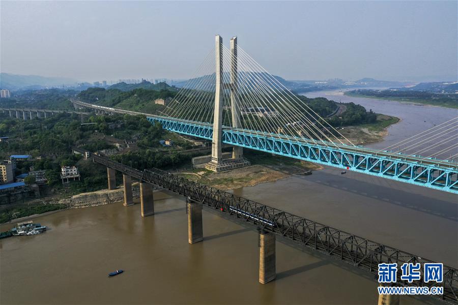 重慶白沙沱長江大橋(下)和新白沙沱長江特大橋(上)(4月23日無人機(jī)拍攝)。 4月23日下午5點(diǎn)40分,隨著重慶白沙沱長江大橋通行的最后一列客運(yùn)列車順利通過,這座“服役”了59年的重慶首座長江大橋進(jìn)入“退役”倒計(jì)時(shí)。4月24日后,所有列車將改線經(jīng)距白沙沱長江大橋約100米的新白沙沱長江特大橋通行,新橋“接力”老橋,運(yùn)輸能力將得到大幅提升。 白沙沱長江大橋于1958年開工,1960年通過首趟列車,是繼武漢長江大橋之后的第二座長江大橋。 新華社記者 劉潺 攝