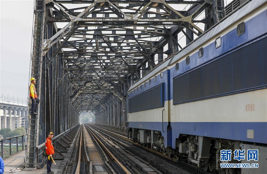中國鐵路成都局有限公司重慶工務段的巡檢班組在白沙沱長江大橋上等待機車通過后繼續(xù)作業(yè)(4月23日攝)。 4月23日下午5點40分,隨著重慶白沙沱長江大橋通行的最后一列客運列車順利通過,這座“服役”了59年的重慶首座長江大橋進入“退役”倒計時。4月24日后,所有列車將改線經(jīng)距白沙沱長江大橋約100米的新白沙沱長江特大橋通行,新橋“接力”老橋,運輸能力將得到大幅提升。 白沙沱長江大橋于1958年開工,1960年通過首趟列車,是繼武漢長江大橋之后的第二座長江大橋。 新華社記者 劉潺 攝