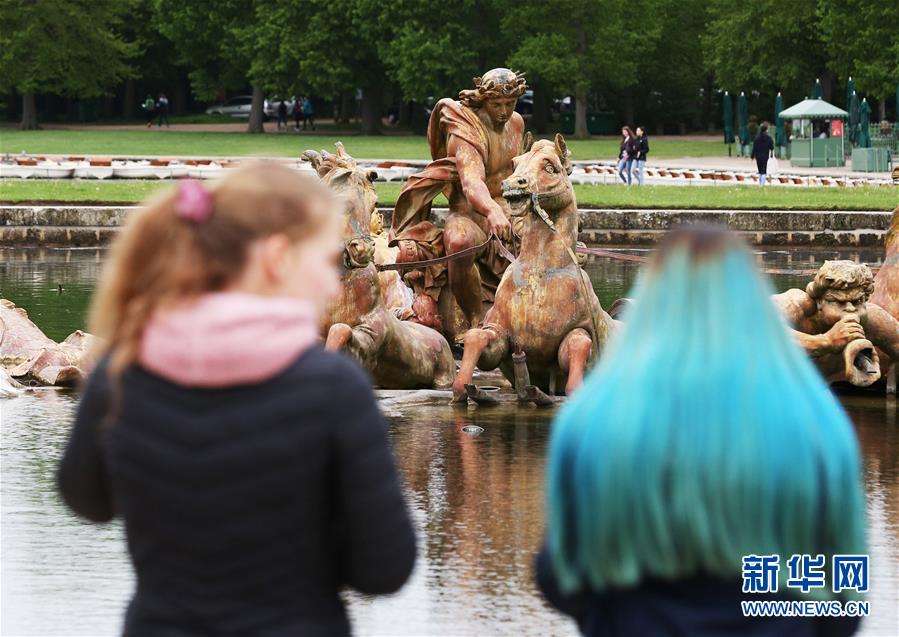 4月25日,在法國巴黎近郊,兩個女孩在凡爾賽花園內(nèi)欣賞噴泉。新華社記者高靜攝