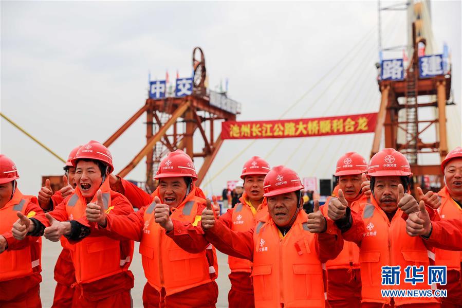 4月2日,工人慶祝池州長江公路大橋順利合龍。 新華社記者曹力攝
