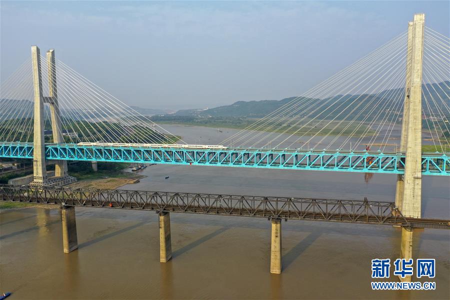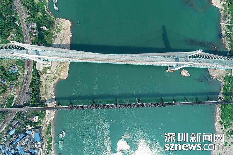 新白沙沱長江特大橋在老橋下游100米左右位置跨越長江,全長約5.3公里,為上下兩層六線鐵路橋,上層為四線鐵路客運專線,2018年1月25日隨著渝貴鐵路通車正式投入運營。該橋是渝貴鐵路全線規(guī)模最大、技術(shù)最為復(fù)雜的控制性工程,是世界上首座六線鐵路鋼桁梁斜拉橋,也是世界上每延米載荷量最大的橋梁,同時也是世界上首座雙層鐵路鋼桁梁斜拉橋。